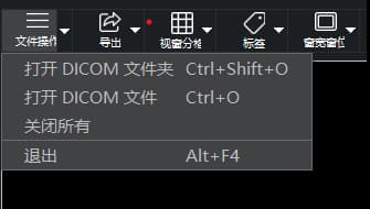 单击工具栏上文件操作图标旁边的箭头,或使用Ctrl+O键盘快捷键即可打开DICOM文件。单击打开DICOM文件。