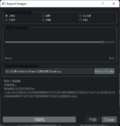 单击导出单张图像;将打开导出窗口,以便您可以选择目标格式和图像质量以及导出文件的存放路径;JPEG Quality表示所要导出的图片质量。向左移动滑块以减小目标文件大小(质量较差),向右移动滑块以获得较大的目标文件(质量较好);单击”Select Folder”浏览目标文件夹;单击”start”后,导出过程将开始,导出的进度将显示在下方的状态栏上。