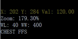 左下角展示:鼠标光标位置(显示的DICOM图像中像素的坐标)和像素值、窗口级别和窗口宽度(亮度和对比度);