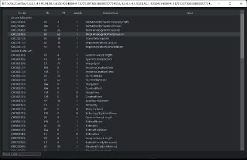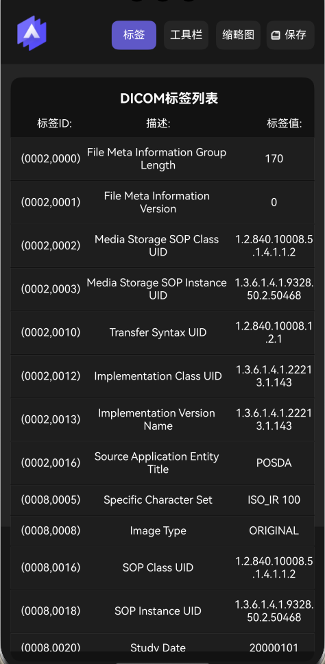 显示标签。显示出DICOM文件的各标签项信息,如下图所示。