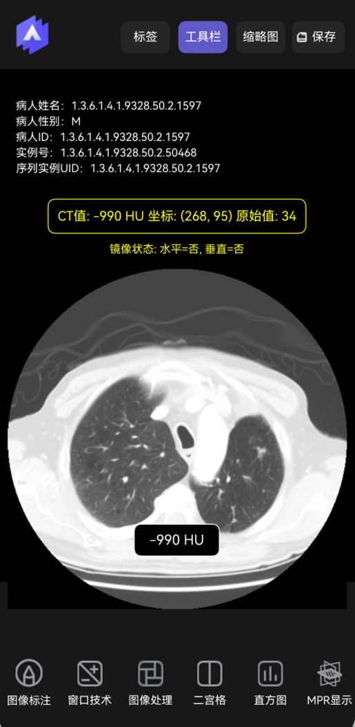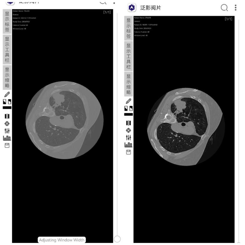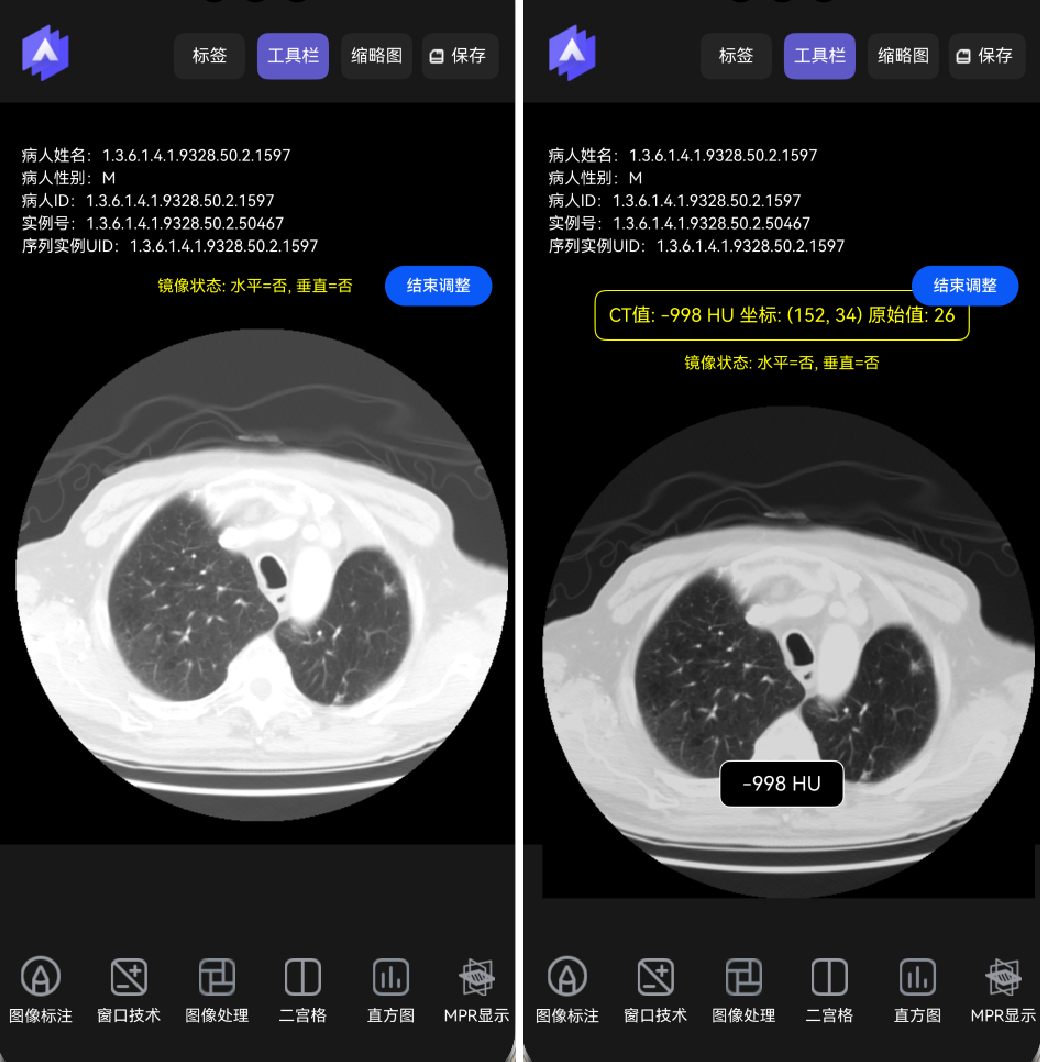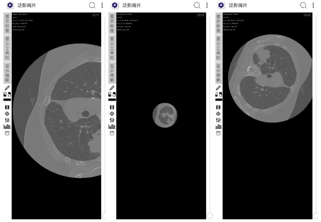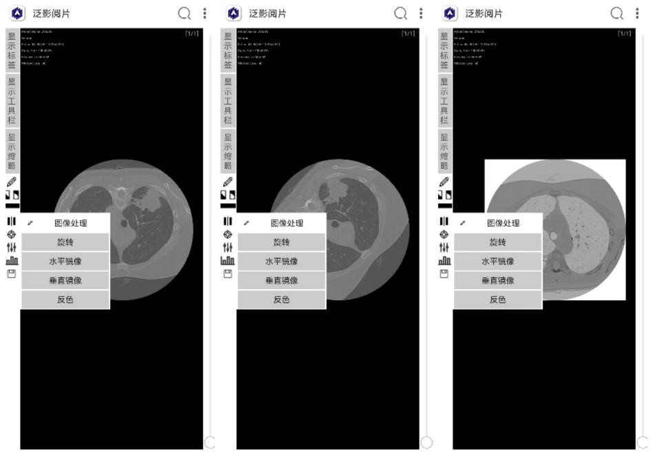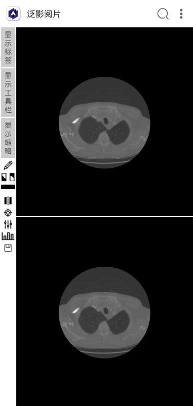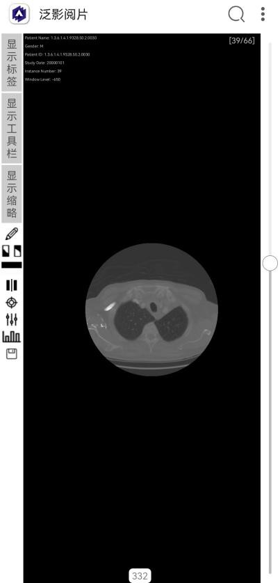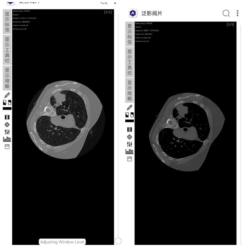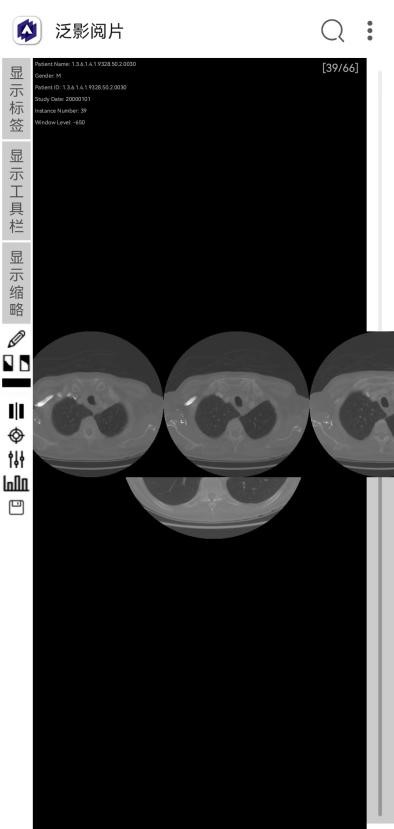 打开DICOM图像后,可以直接在界面上对图像进行拖动平移、双指缩放及旋转操作,如下图所示。