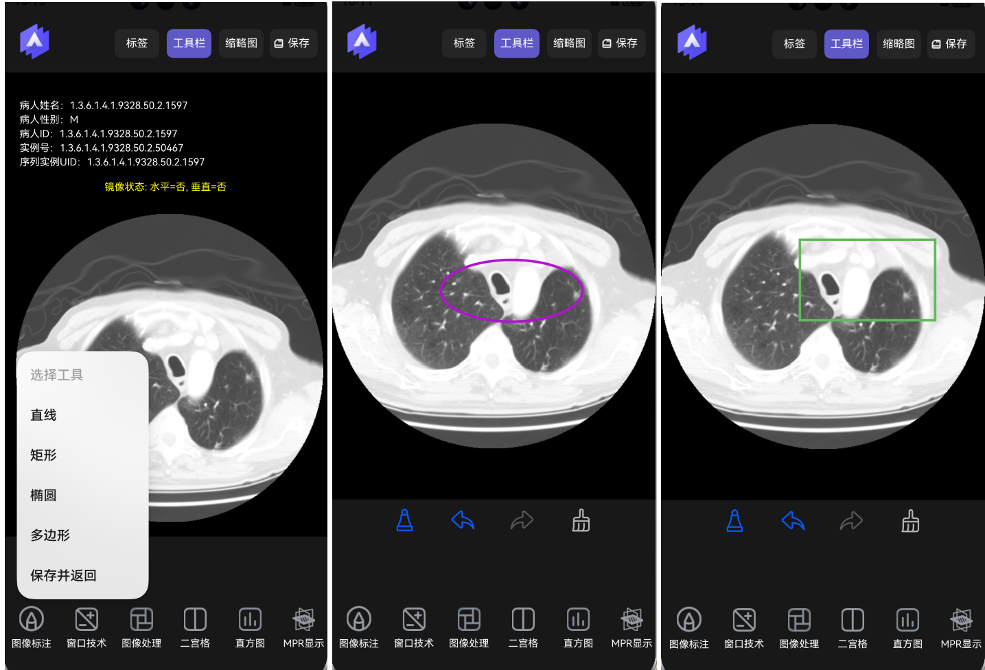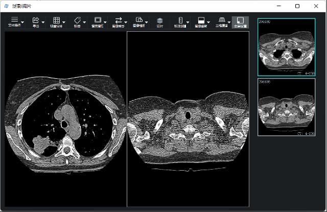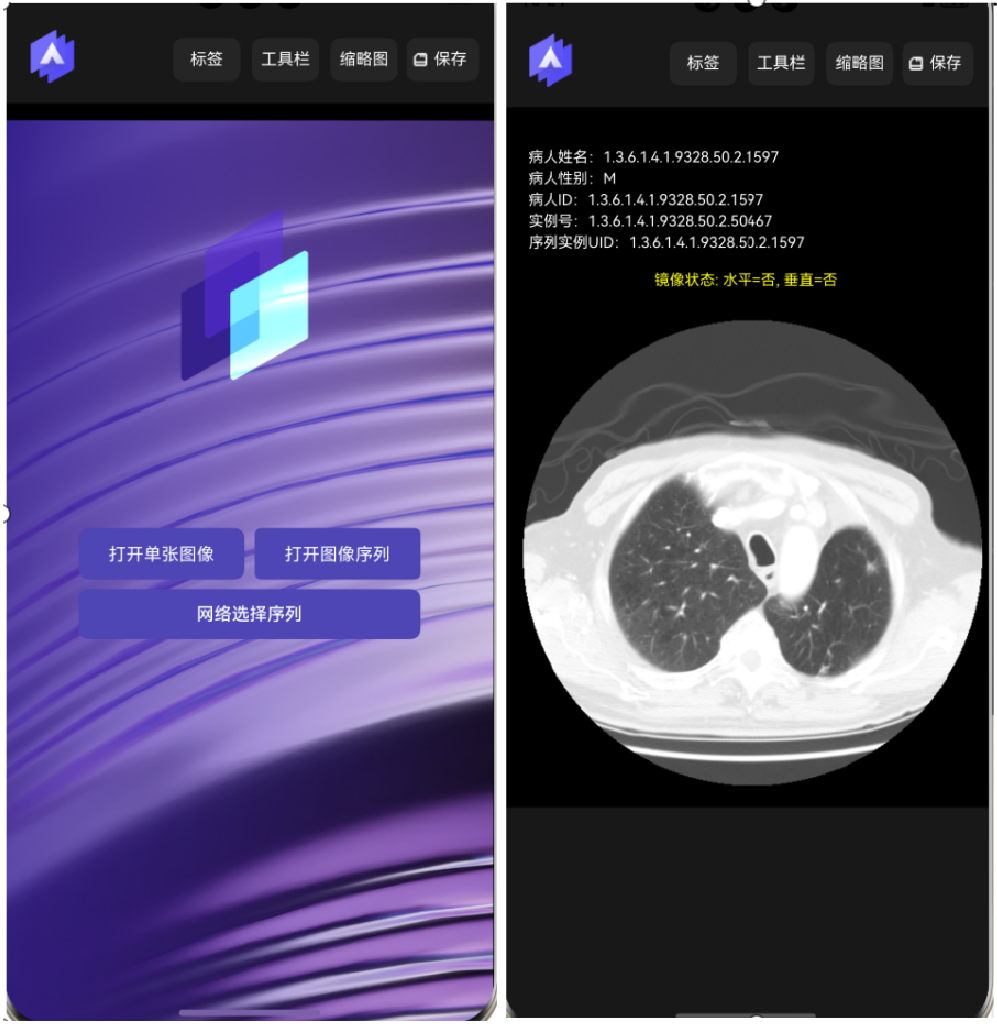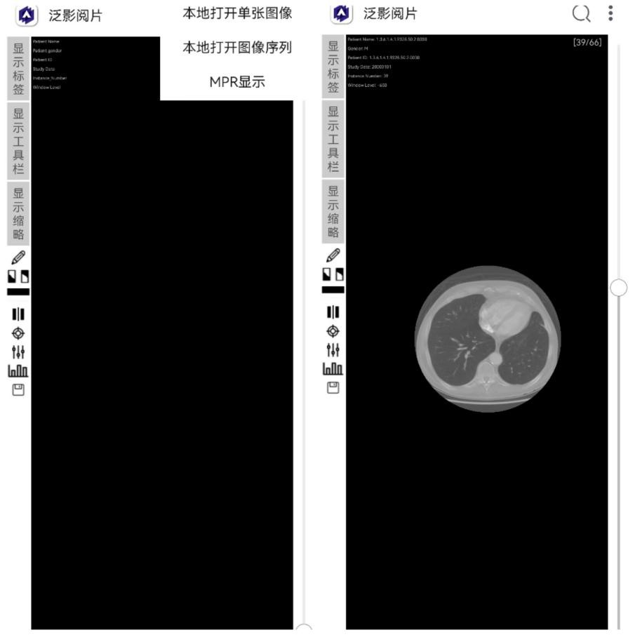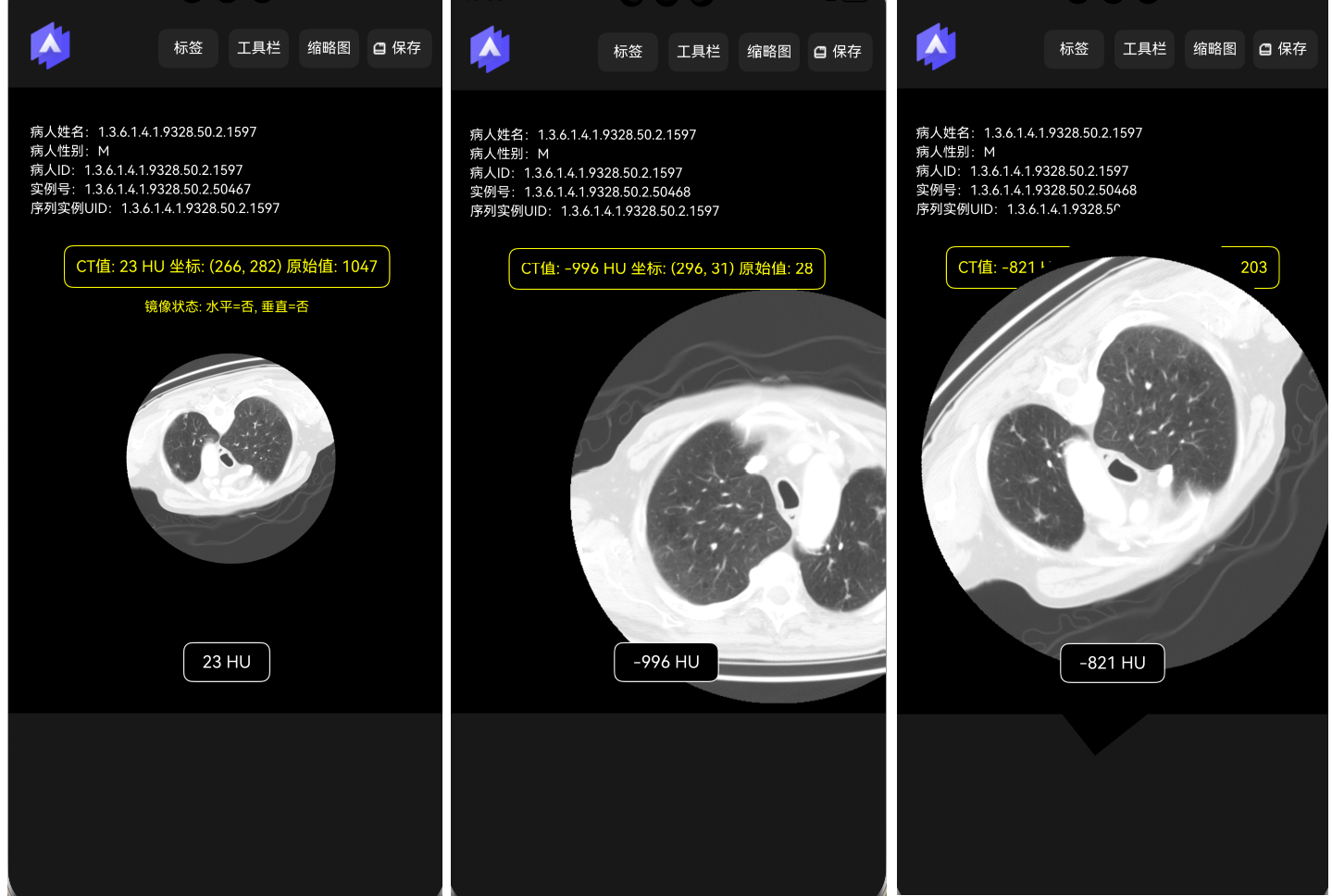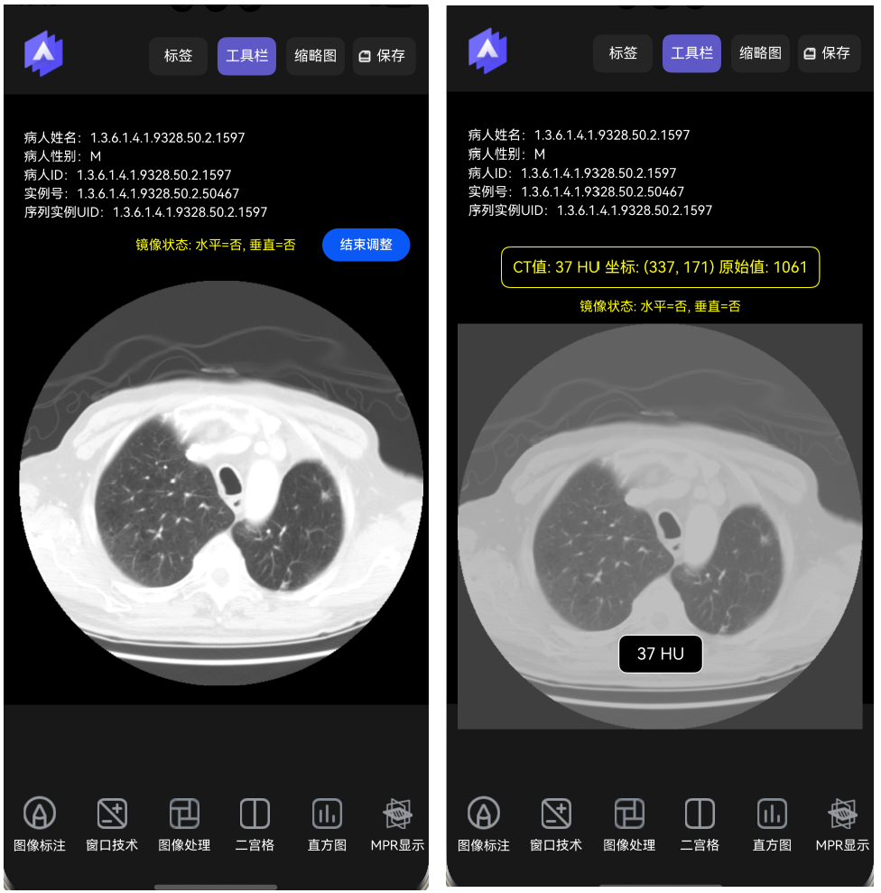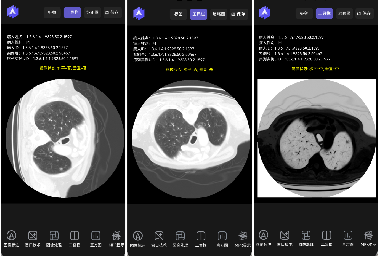 打开DICOM图像后,可以直接在界面上对图像进行拖动平移、双指缩放及旋转操作,如下图所示。