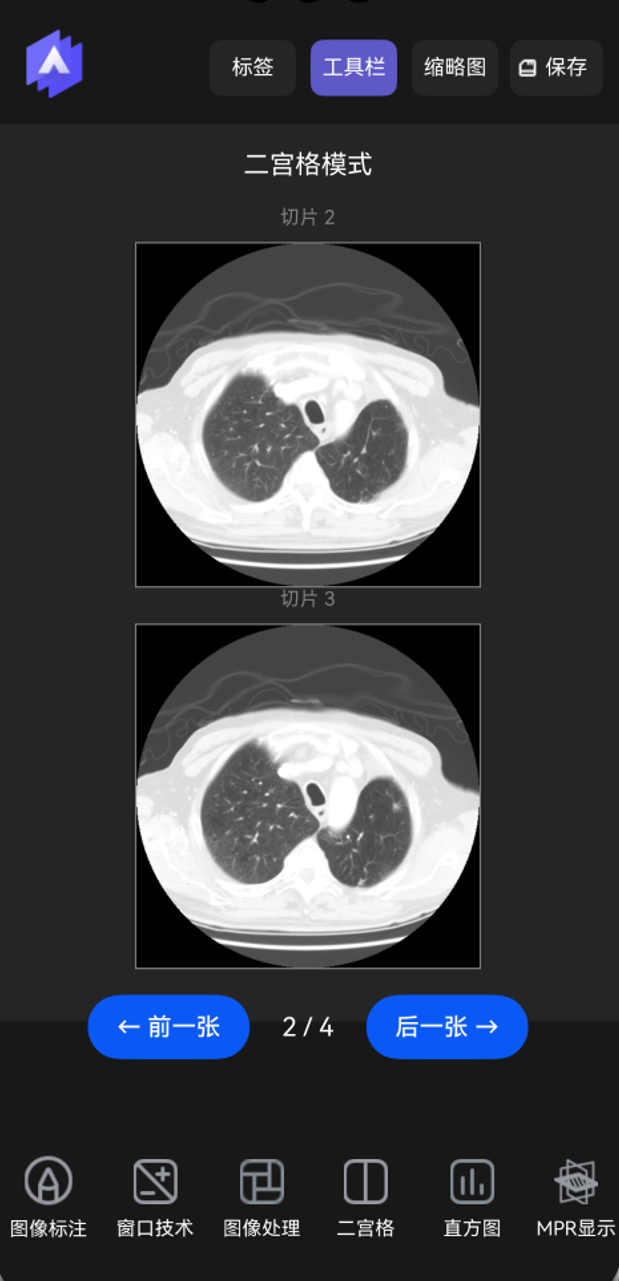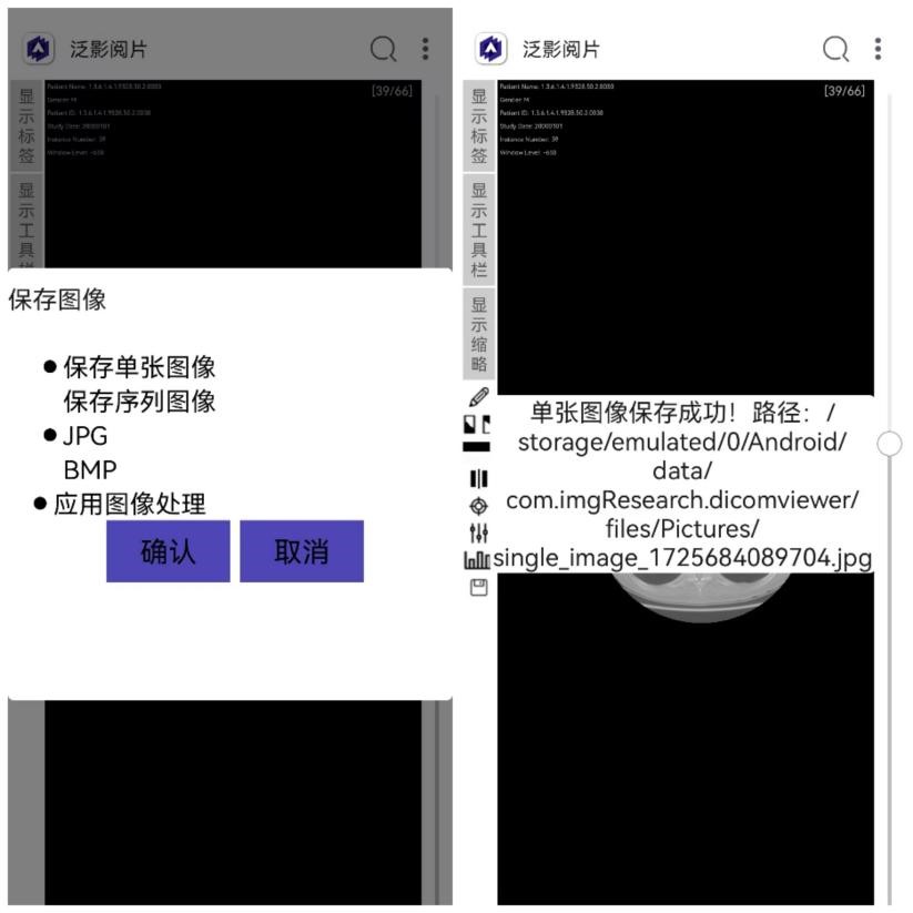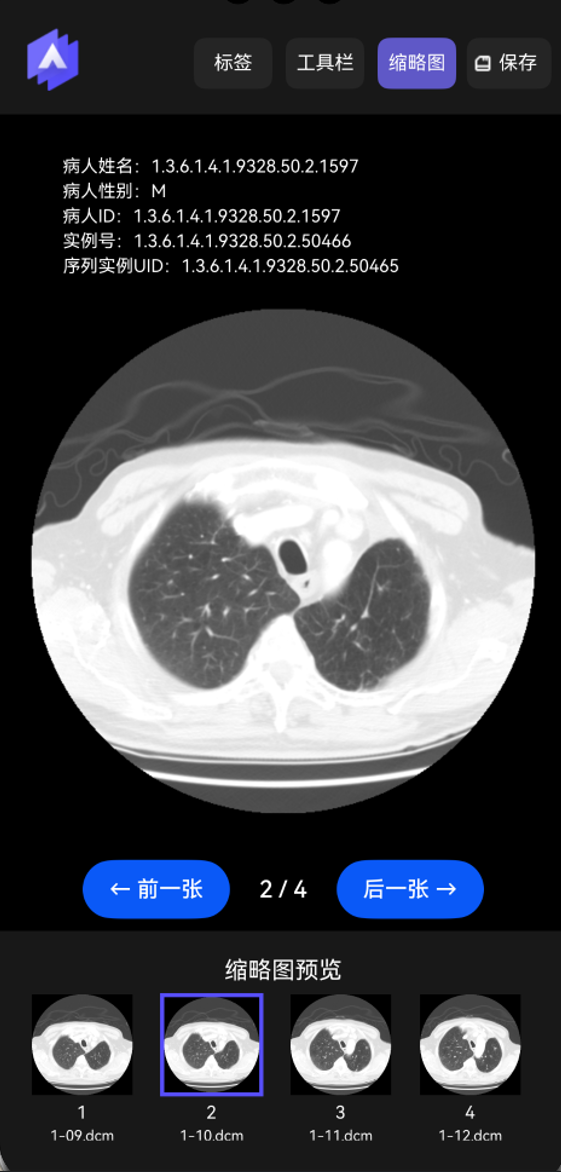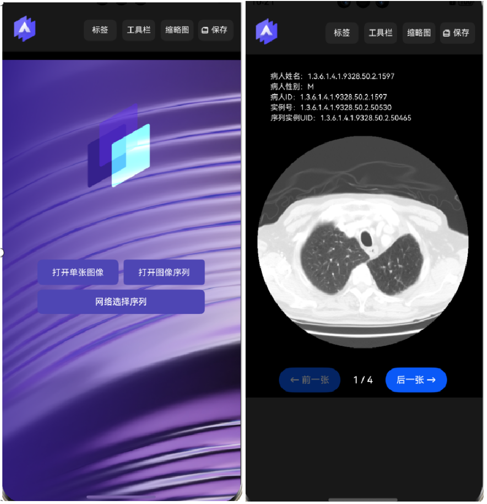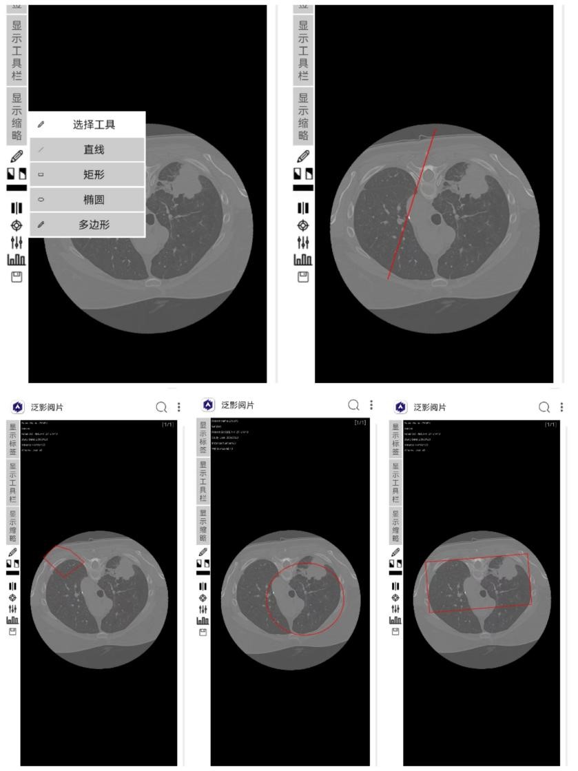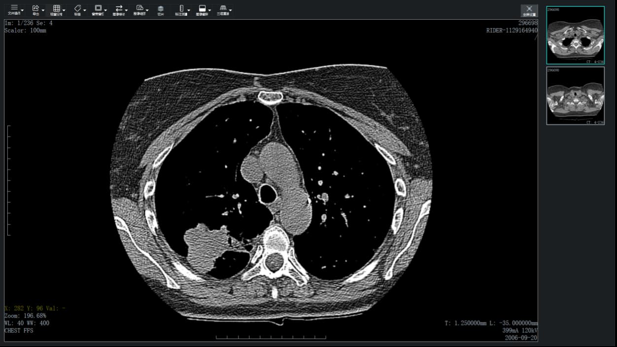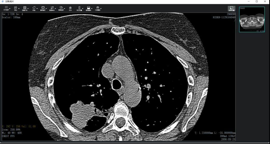 打开DICOM图像后,可以直接在界面上对图像进行拖动平移、双指缩放及旋转操作,如下图所示。