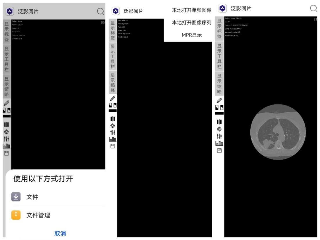 找到DICOM文件,进行选择,然后单击“打开”,加载过程将开始。若医学图像出现在软件预览框中,您就可以浏览这些图像.您也可以使用更快的方法:将选定的DICOM文件拖放到泛影阅片主窗口中。