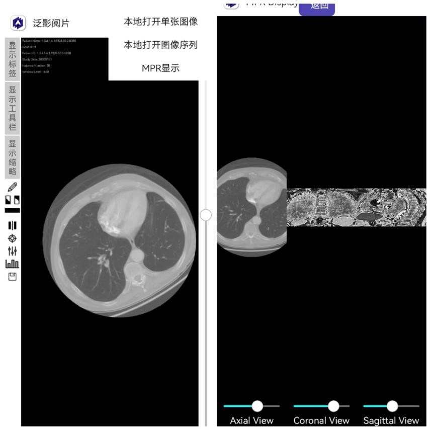 打开序列后,可以选择MPR(多平面重构)显示功能。在MPR页面会将原始的轴状面图像序列进行三维重构,拖动冠状面及矢状面的滑动条可以分别针对这两个维度在不同位置上进行切面,以形成重构出的对应图像,如下图所示。