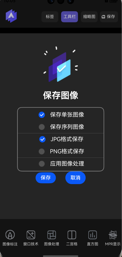 保存图像。可选保存单张或是序列,保存图像格式及是否保存图像处理情况,如下图所示。